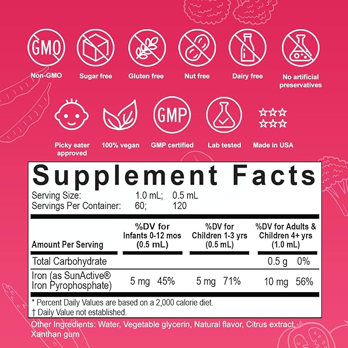 - Clean, Parent-Approved Formula – These baby iron drops are 100% vegan, non-GMO, and free from sugar, gluten, dairy, and common allergens. Made in the USA in GMP-compliant facilities, it's a safe, trusted iron supplement for toddlers and kids.
