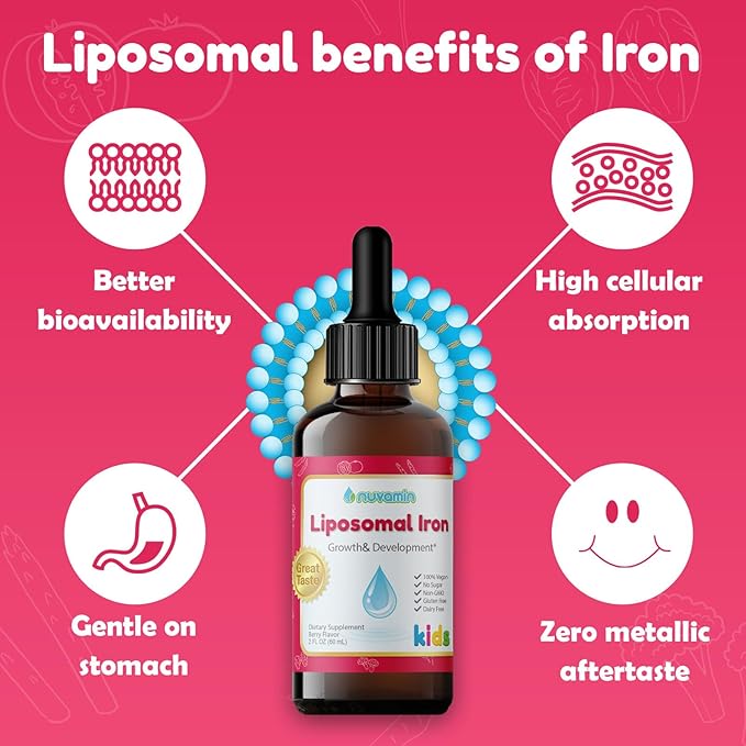 - Berry-Flavored Liquid Iron – Nuvamin's delicious liquid iron for toddlers is crafted for higher absorption and better taste than traditional iron supplements. These kids iron drops are perfect for daily use without the struggle.