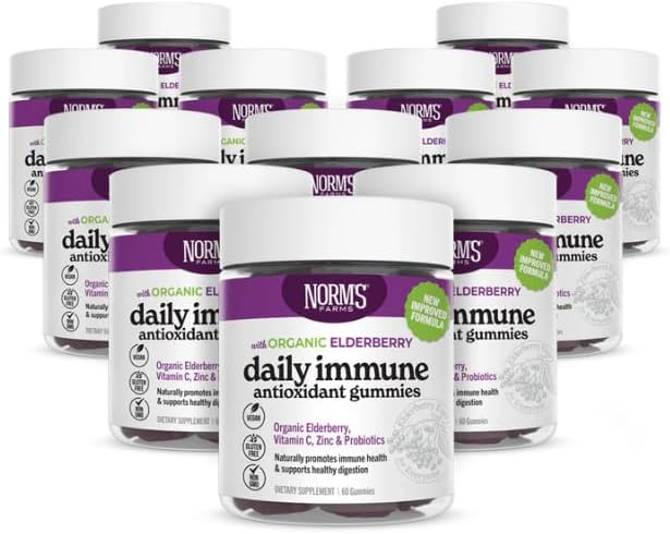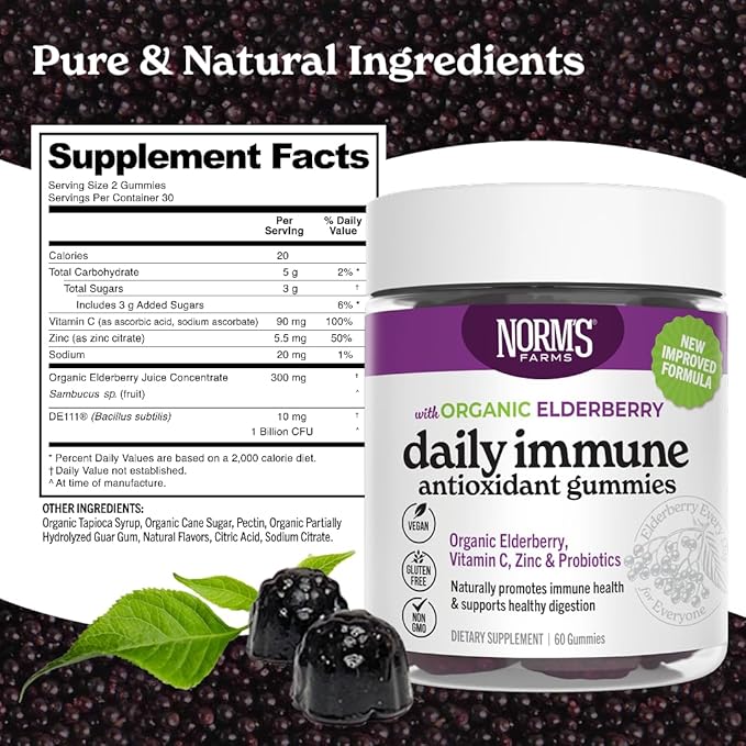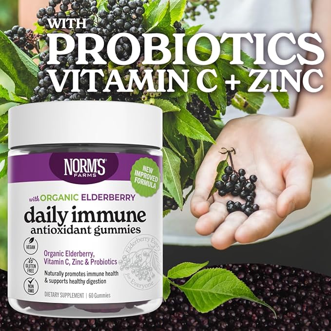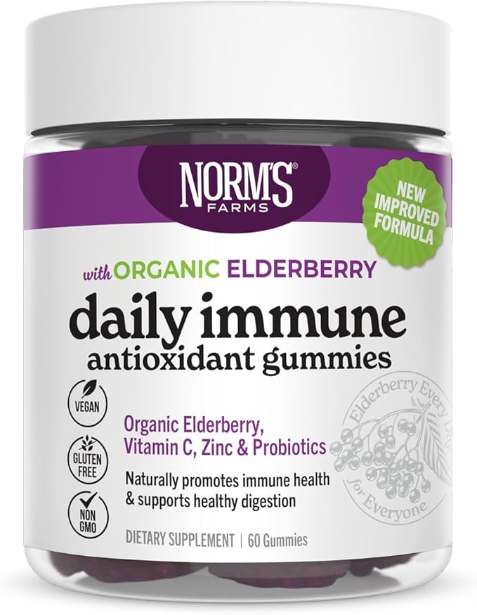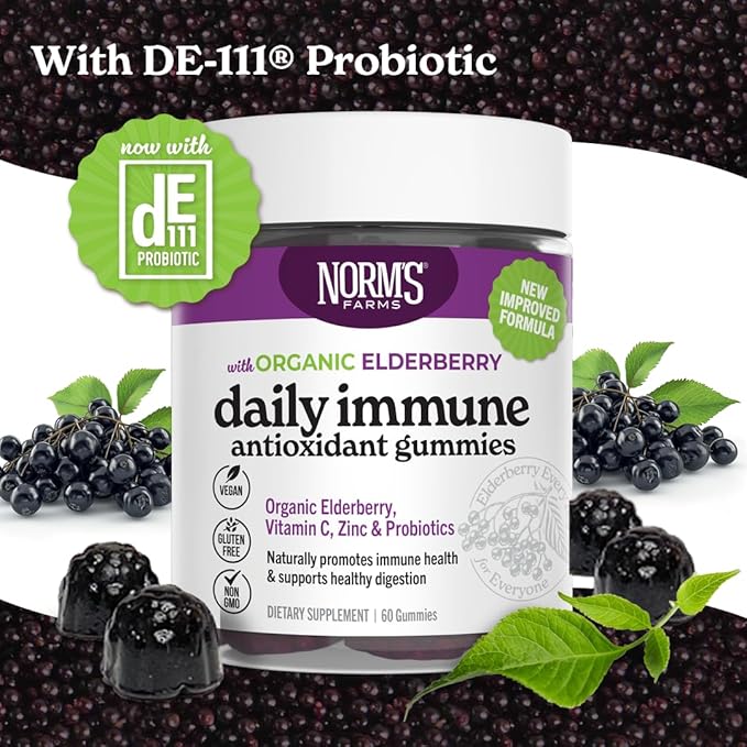 Norm's Farms Organic Elderberry Gummies - Daily Immune Support for Adults & Kids with Zinc, DE111 Probiotic, Vitamin C - Made in USA, 3rd Party Tested - Vegan, Gluten-Free, Kosher, Non-GMO, 60 Gummies
