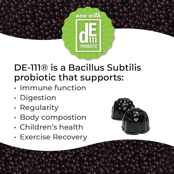 - SCIENCE-BACKED CLEAN FORMULA: Our black elderberry gummies have 10mg of DE111 (Bacillus subtilis), a clinically proven probiotic for gut and immune health, blended into a vegan, gluten-free, non-GMO formula with no artificial additives or animal-derived ingredients.