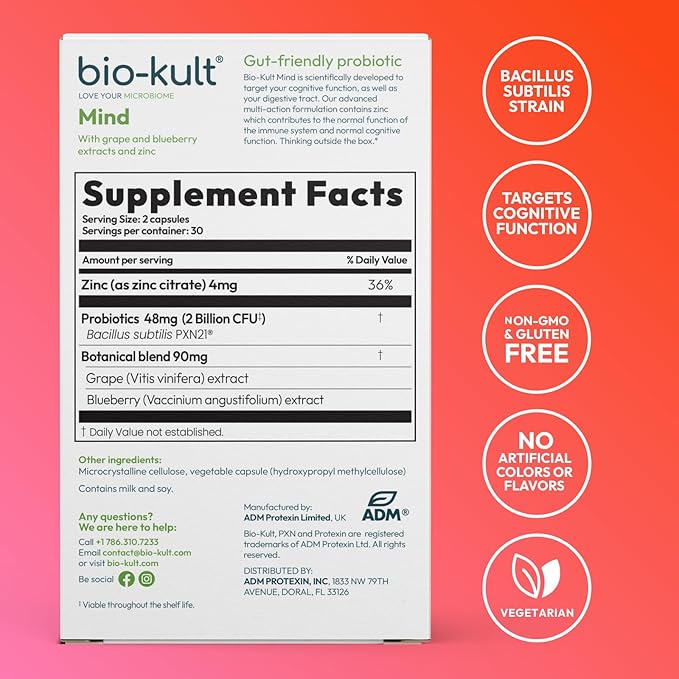 Bio-Kult Mind | Bacillus + Zinc, Grape & Blueberry Extracts | Brain & Gut Support | Cognitive Function | 60 Capsules