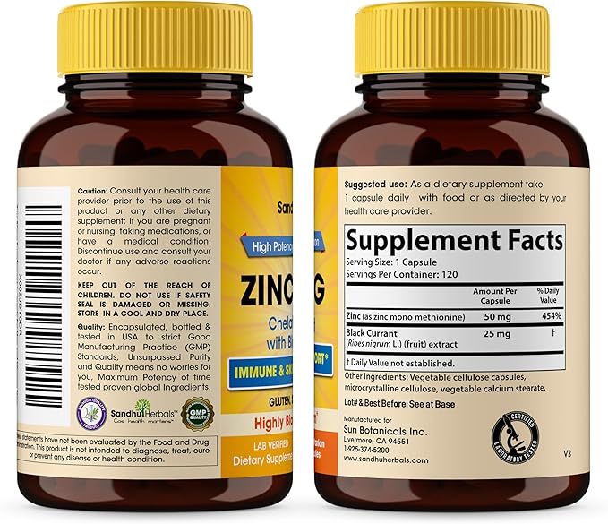 Zinc Supplements for Men and Women | Zinc 50mg with Black Currant 120 Vegetarian Capsules | Highly Absorbable Form for Immune Support | Zink 50 mg Supplement Promotes Skin Health