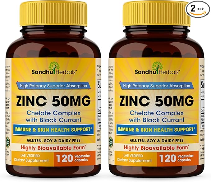 Sandhu Herbals Zinc 50mg Supplement for Men & Women| High Absorption Monomethionine Complex with Black Currant 120 Capsules (Pack of 2)| Zink Supplements for Immune, Acne & Antioxidant Support