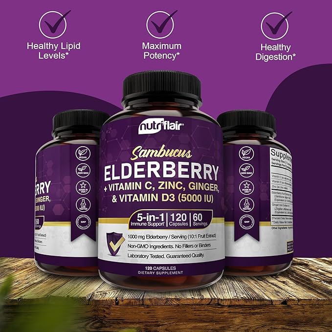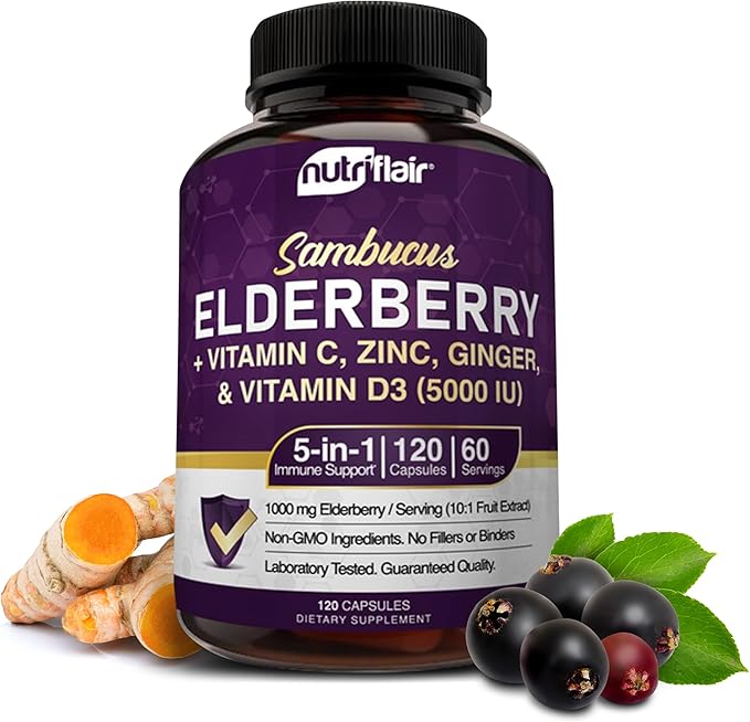 - ELDERBERRY PLUS VITAMIN C, D3, ZINC: The NutriFlair Elderberry supplement for adults is a comprehensive blend of five high-grade ingredients known to help support the immune system. This 5-in-1 complex contains a potent dose of Vitamins C, Vitamin D (5000 IU), Zinc, Ginger, and Sambucus Elderberry, enhancing its immune-supporting capabilities.