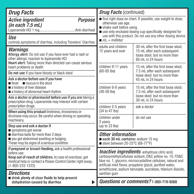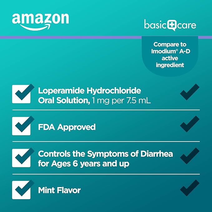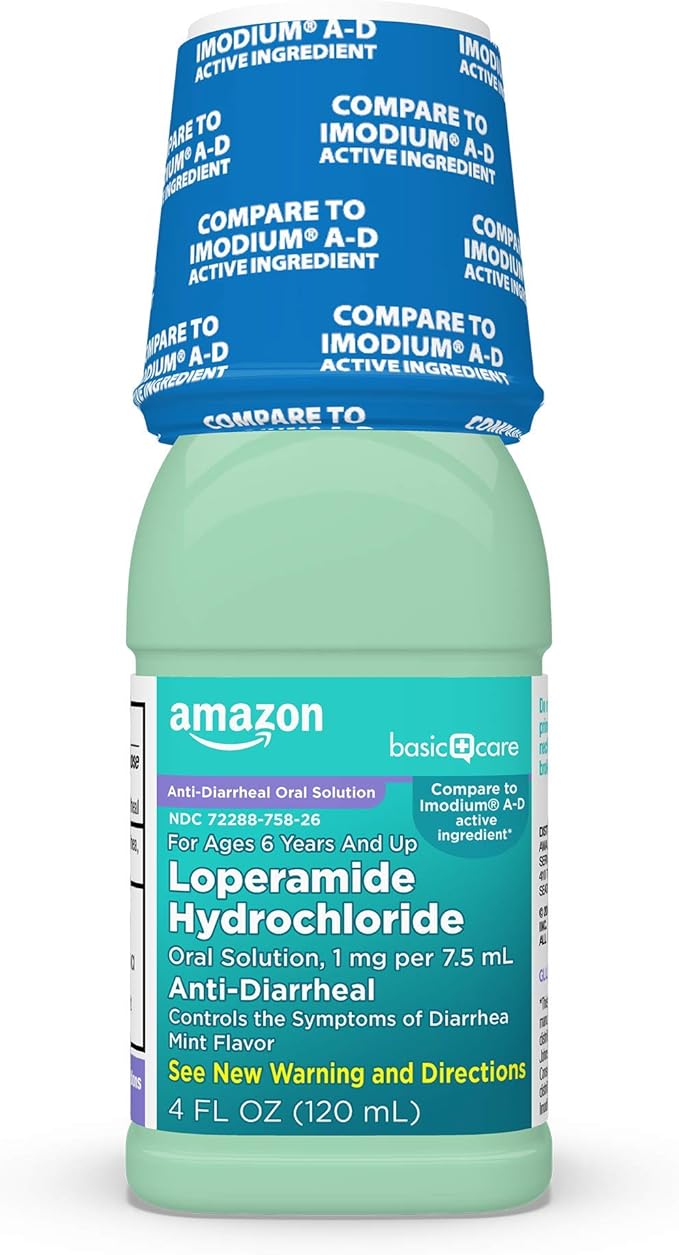 Amazon Basic Care Loperamide Hydrochloride Oral Solution, 1 mg per 7.5 mL, Mint Flavor, Anti-Diarrheal Medicine for Ages 6 Years and up, 4 fl oz (Pack of 1)