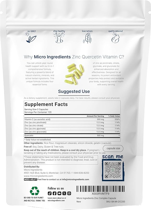 - Each pouch provides 240 total capsules with 120 servings and a 2-capsule serving size. This offers a zinc 50mg complex of picolinate, citrate, glycinate, and gluconate, as well as quercetin 500mg as sophora japonica and vitamin C 500mg as ascorbic acid.