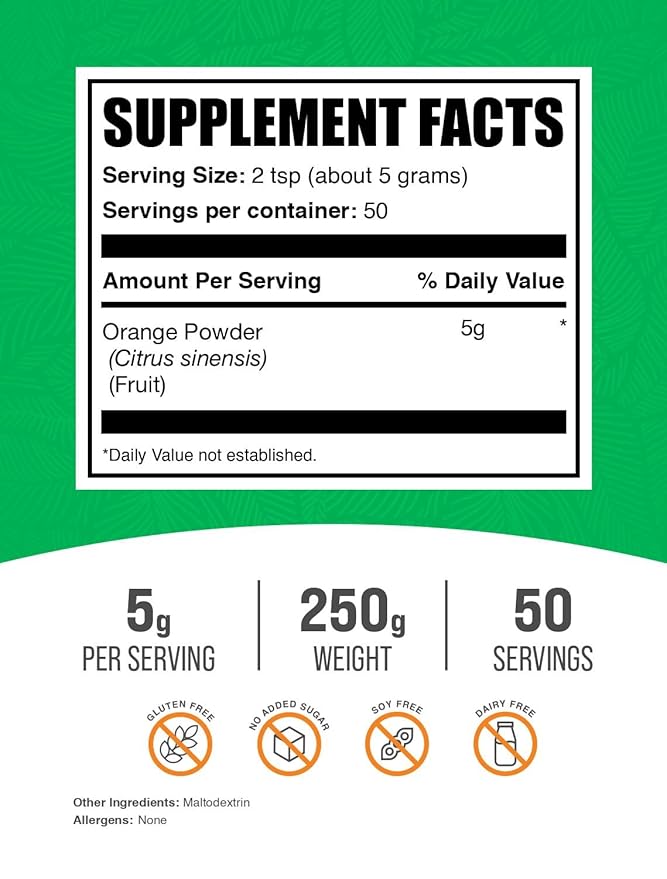 BulkSupplements.com Orange Powder - Orange Fruit Powder, Nutrient-Rich Flavoring - Gluten Free, 5g per Serving, 250g (8.8 oz) (Pack of 1)