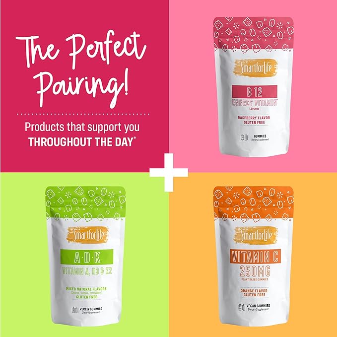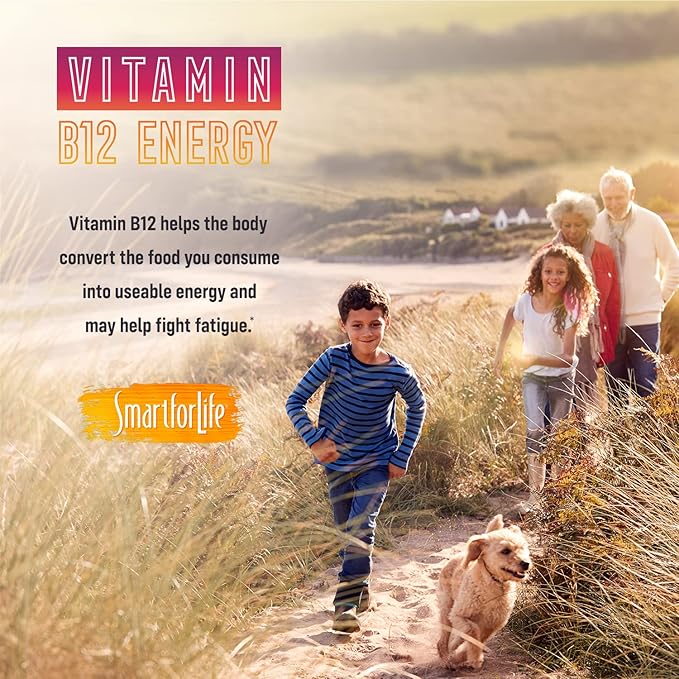 - B12 VITAMIN GUMMIES: Smart for Life Vitamin B12 Gummies for adults have high absorbency and are made better with their delicious raspberry taste. So, forget the pills! Get your dose of daily nutrition in a delightfully chewy gummy with a fruity taste even the pickiest kid (or adult) will enjoy. Made with pectin, a natural soluble fiber found in fruit, pure cane sugar and natural flavors, these gummies are vegan, non-GMO, gluten free, and gelatin free.