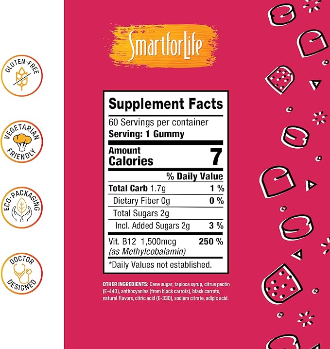 - DOCTOR DESIGNED, QUALITY ASSURED: Smart for Life Vitamin B12 gummies for adults is scientifically formulated for optimal health. Natural, non-GMO and gluten-free, this plant-based supplement is free of harmful chemicals and preservatives. SFL products are made here in the USA and in an SQF Level 2 Certified facility. Having third party certification means these products comply with specific standards set for safety, quality and performance.