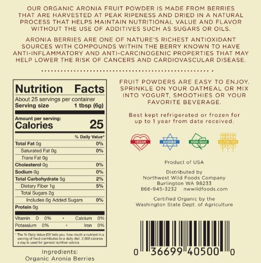 Organic Aronia Fruit Powder - Northwest Wild Foods - Sweet Antioxidant Healthy Pure Dried Fruit Natural Hand Harvested - in Smoothies, Oatmeal, Dessert (1 Pound)
