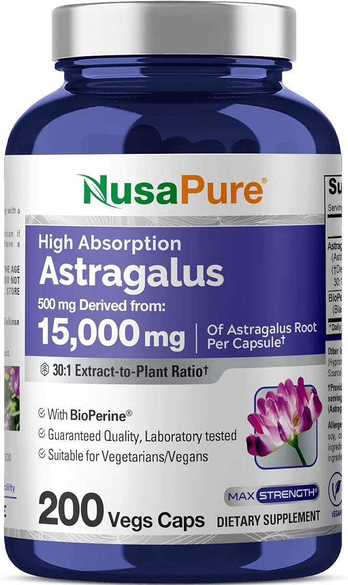 - Astragalus 15,000mg. Each capsule delivers the equivalence of 15,000 mg of Astragalus root. Extract 30:1
