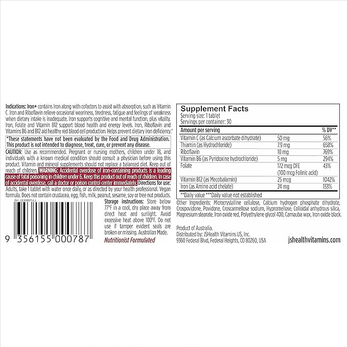 - No Negative Side Effects: Unlike many other iron vitamins, JShealth iron+ will not cause nausea or constipation. Our supplement uses iron amino acid chelate which has been found to be well absorbed, better tolerated by the body, and less likely to cause constipation or other digestive issues.