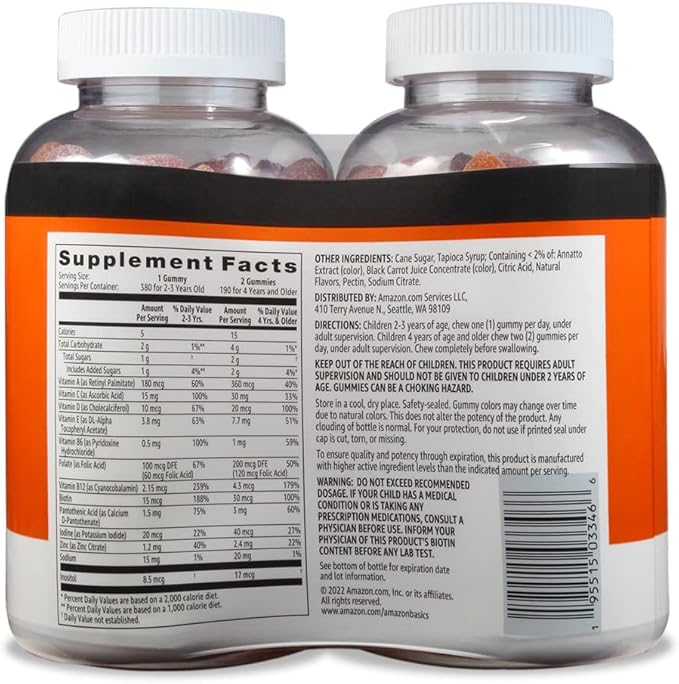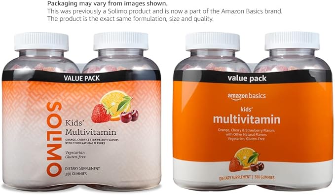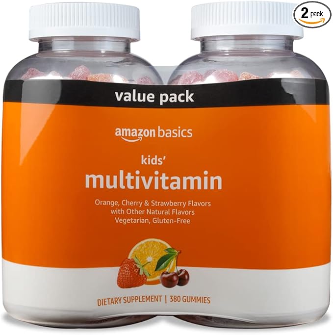 Amazon Basics Kids' Multivitamin Gummies, Cherry, Strawberry & Orange, 380 Count (2 Packs of 190) (2 per Serving) (Previously Solimo)