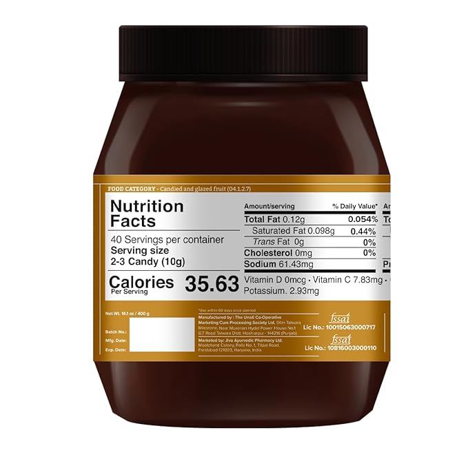 - Amla Chatpata Candy, rich in Vitamin C, made with amla, sugar, black pepper, and spice mix.