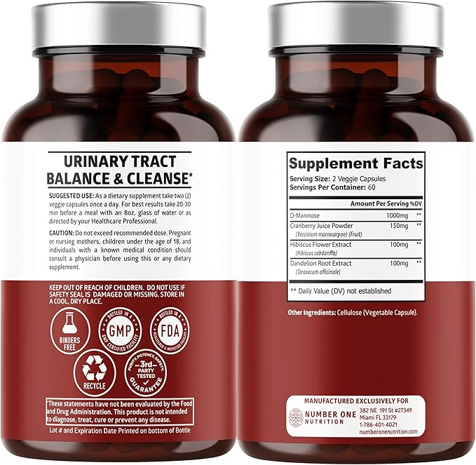 Number One Nutrition Premium D Mannose with Cranberry and Hibiscus [Max Strength, 1350mg] 120 Capsules