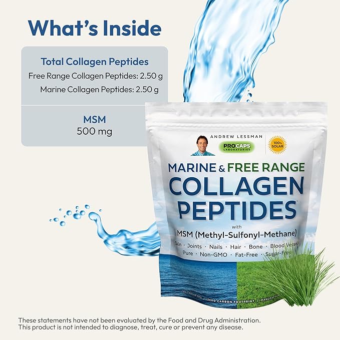 ANDREW LESSMAN Marine, Free Range Collagen Peptides Powder and MSM 120 Servings - Supports Radiant Smooth Soft Skin, Comfortable Joints. Super Soluble No Fishy Flavor No Additives Non-GMO