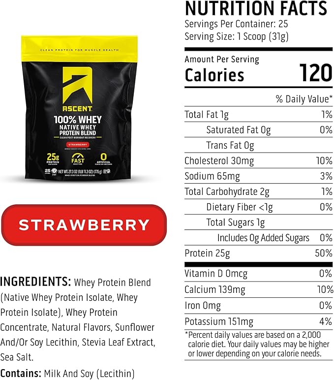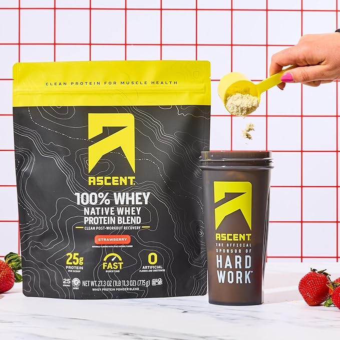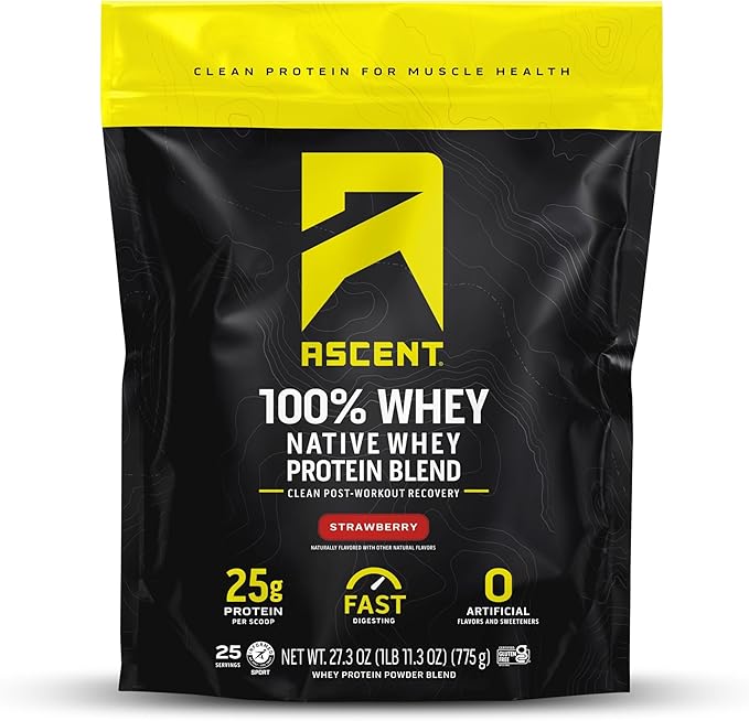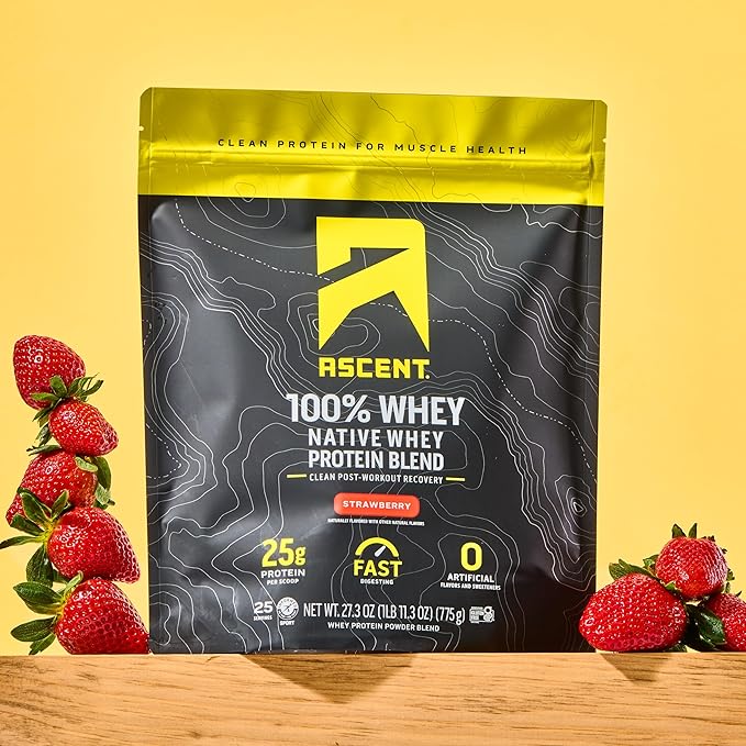 Ascent 100% Whey Protein Powder - Post Workout Whey Protein Isolate, Zero Artificial Flavors & Sweeteners, Gluten Free, 5.5g BCAA, 2.6g Leucine, Essential Amino Acids, Strawberry 1.7 lb