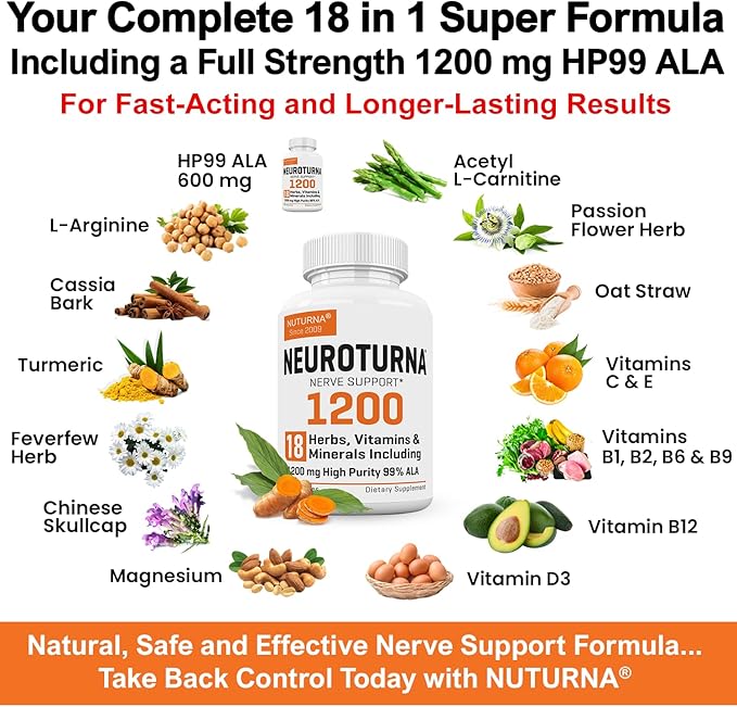 - ✅ YOU GET 5 FANTASTIC BENEFITS in ONE EASY to TAKE CAPSULE… (1) Contains All 10 Science-Backed Vitamins, Minerals and Herbs in the necessary dose YOU need (2) Includes a Maximum Strength 1200 mg ALA Alpha Lipoic Acid Daily Dose (3) The Unique NUTURNA Proprietary Blend of Natural Ingredients (4) Pharmacist Formulated with 18 Premium Ingredients...