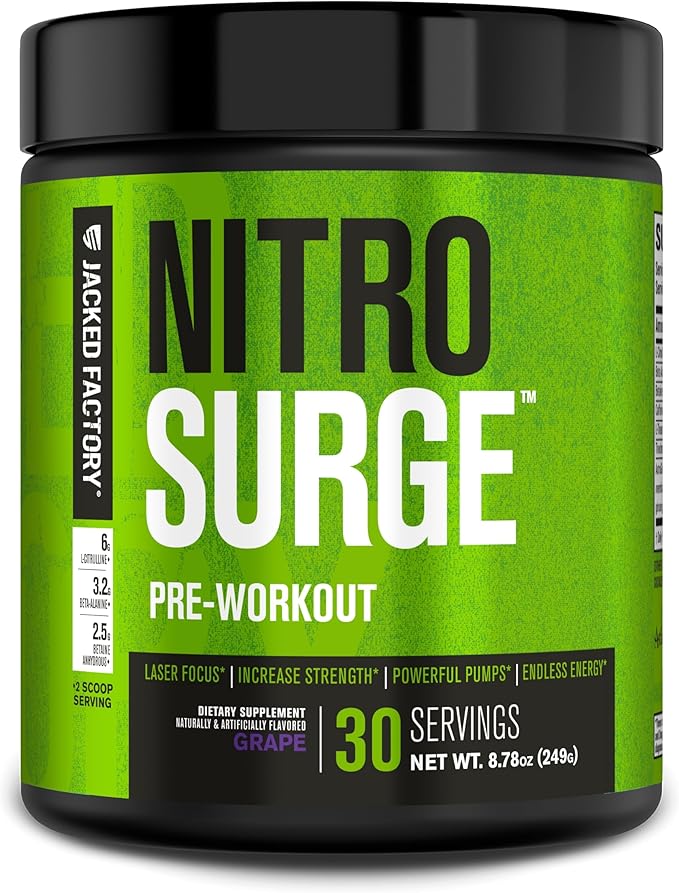 Jacked Factory NITROSURGE Pre Workout Supplement - Endless Energy, Instant Strength Gains, Clear Focus, Intense Pumps - Nitric Oxide Booster & Powerful Preworkout Energy Powder - 30 Servings, Grape
