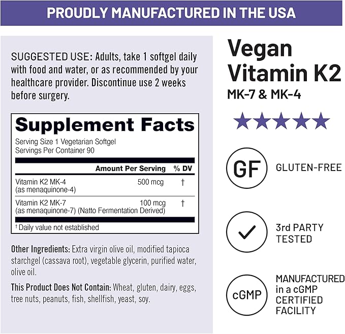 - 3rd PARTY TESTED, QUALITY ASSURED: Vitamin K2 softgels are 3rd party tested for purity and efficacy and manufactured in the USA with high-quality ingredients from around the world in a cGMP-certified facility.