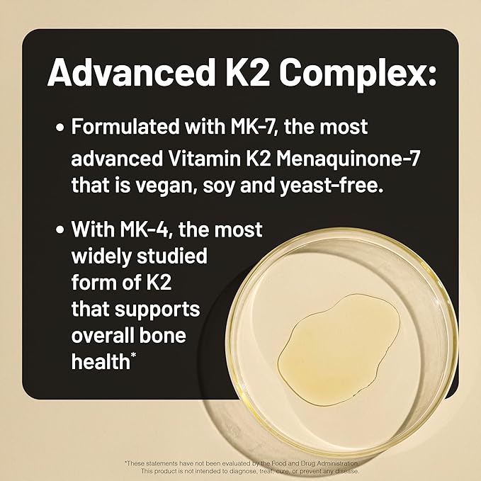 - VITAMIN K2 COMPLEX: Every vitamin K2 softgel is formulated with a combination of two distinct vitamin K2 subtypes: MK-4 and MK-7. MK-4 is the most clinically studied form of K2 that can support overall bone health, while MK-7 is the most absorption-friendly, bioavailable form of vitamin K2.