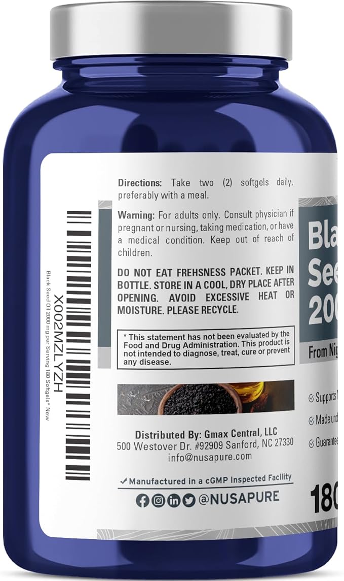 - Non-GMO, Gluten-Free Black Cumin seed oil 2,000 mg per serving 180 softgels per bottle for a 90-Day supply