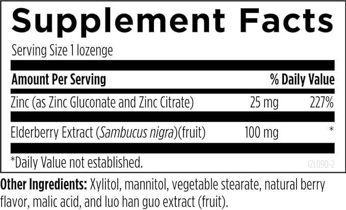 - Zinc + Elderberry - Each lozenge provides 25 mg zinc (as zinc gluconate combined with zinc citrate), 100 mg elderberry fruit (Sambucus nigra) and has 0 g sugar.