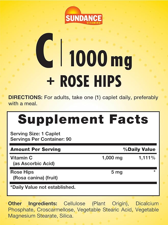 Sundance Vitamin C 1000mg with Rose HIPS | 90 Vegetarian Caplets | Essential Vitamin | Vegetarian, Non-GMO, and Gluten Free Supplement