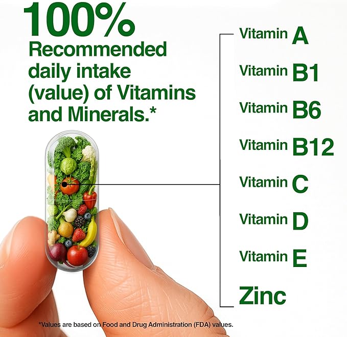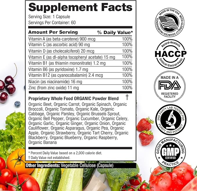 - IMMUNE SYSTEM SUPPLEMENT: Plant based immune support multivitamin capsules provide 1110% daily value of vitamin C, 1040% B12, 706% B6, Vitamin A, Vitamin D, and Zinc; capsules feature nutrients from 25 organic fruits and vegetables. All in one physician-formulated immune support supplement