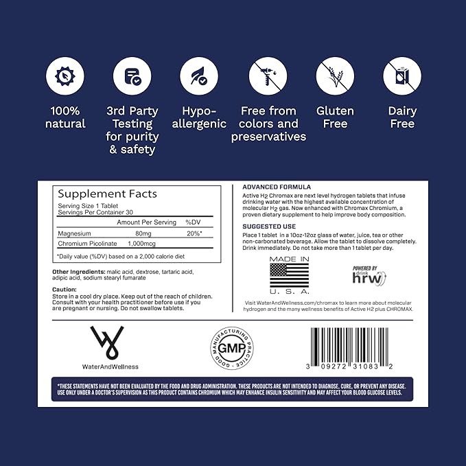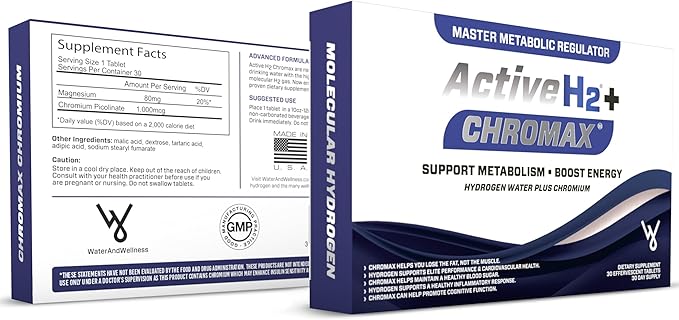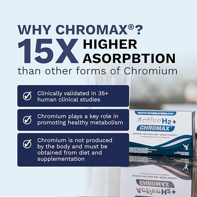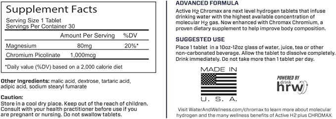 Active H2+ Chromax – Hydrogen Water Tablets with Chromium – Supports Metabolism and Energy – Molecular Hydrogen and Chromium Supplement – 30 Tablets