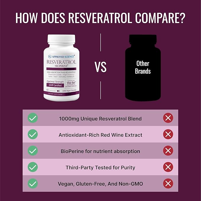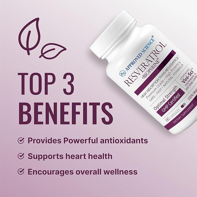 - Bioavailablity - Approved Science Resveratrol contains 5mg of Bioperine, which increases absorption and provides faster results.