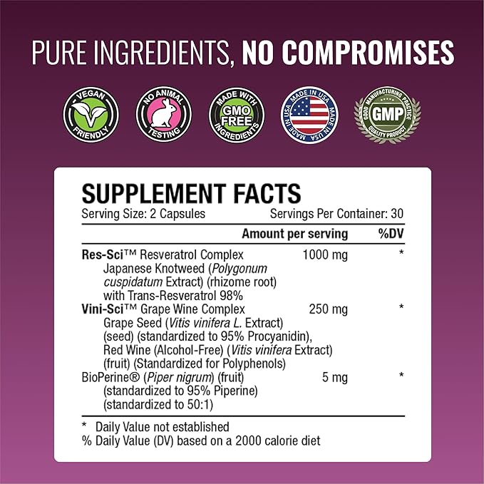 Approved Science® Resveratrol - 1000 mg of Trans Resveratrol - 250 mg of Polyphenol - 98% Purity Level - Includes Bioperine® - 60 Vegan Friendly Capsules - 1 Bottle