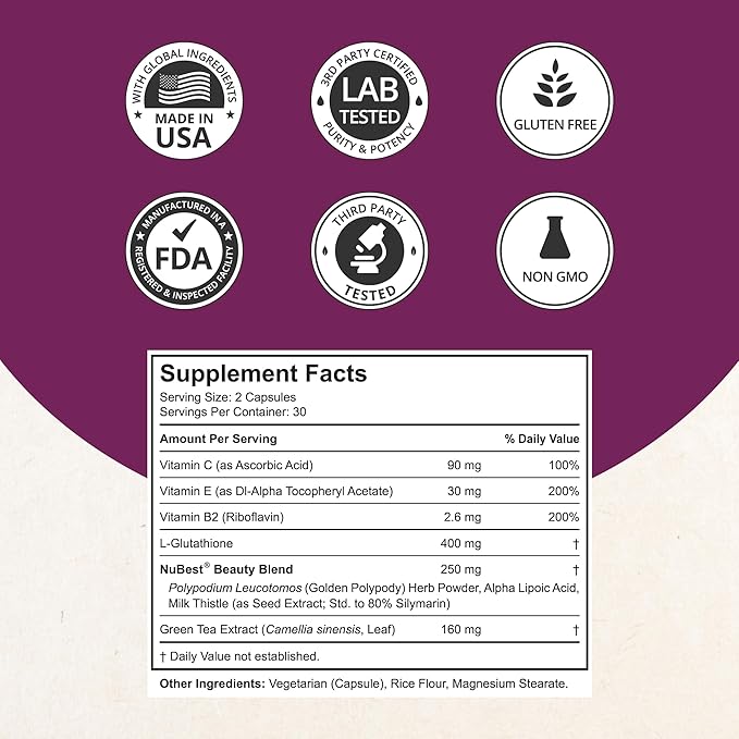 - Skin Beauty Formula: NuBest White contains Glutathione 400mg, L-cysteine, and a proprietary blend consisting of Polypodium Leucotomos, Alpha Lipoic Acid, and Milk Thistle extract which help to beautify skin naturally. This combination of ingredients is an antioxidant formula designed to protect and support cellular function.