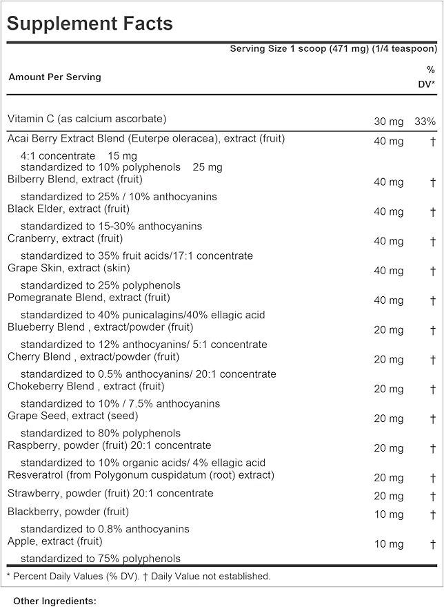 - Superior pure bio-active ingredients - Combines 14 standardized extracts of the most well-researched fruits and berries: Bilberry, Cranberry, Grape seed, Grape skin, Apple, Pomegranate, Acai, Blackberry, Elderberry, Raspberry, Strawberry, Chokeberry, Blueberry, Resveratrol and Vitamin C. Contains no Milk / Dairy-Free, Gluten Free; no soy, yeast, wheat, sodium, salt, sugar, fat, cholesterol, color, preservative, common allergens or manufacturing additives.