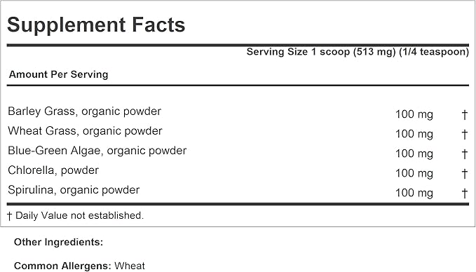 - Superior pure bio-active ingredients - Packed with 100 milligrams each of Barley Grass, Wheat Grass, Blue Green Algae, Chlorella and Spirulina. Contains no Milk / Dairy free. Gluten Free; no soy, yeast, corn, sodium, salt, sugar, fat, cholesterol, color, preservative or manufacturing additives.
