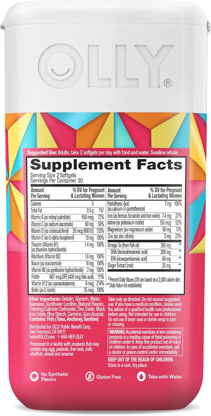 OLLY Ultra Strength Prenatal Multivitamin Softgels, Supports Healthy Growth, Brain Development, Iron, Folic Acid, DHA, Vitamins C, E, 30 Day Supply-60 Count