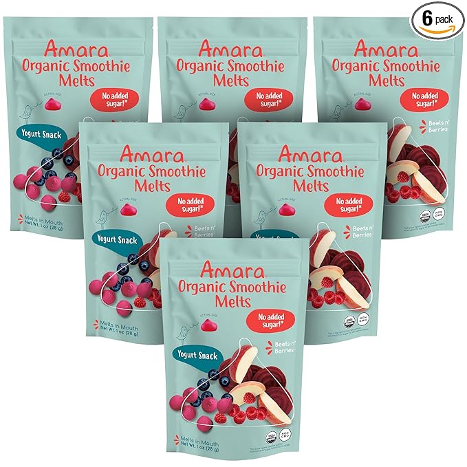 - NO ADDED SUGAR: Amara delivers nutritious baby food and snacks that are 100% organic and non-GMO. The first melt-in-mouth snack without any added sugar or fillers, these melts keep little hands busy and tiny tummies full without the sugar crash.