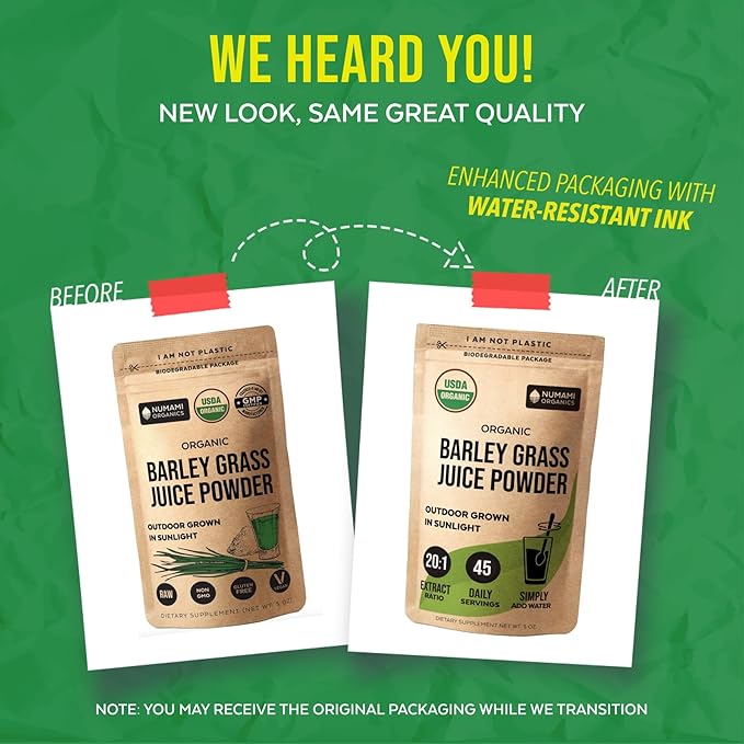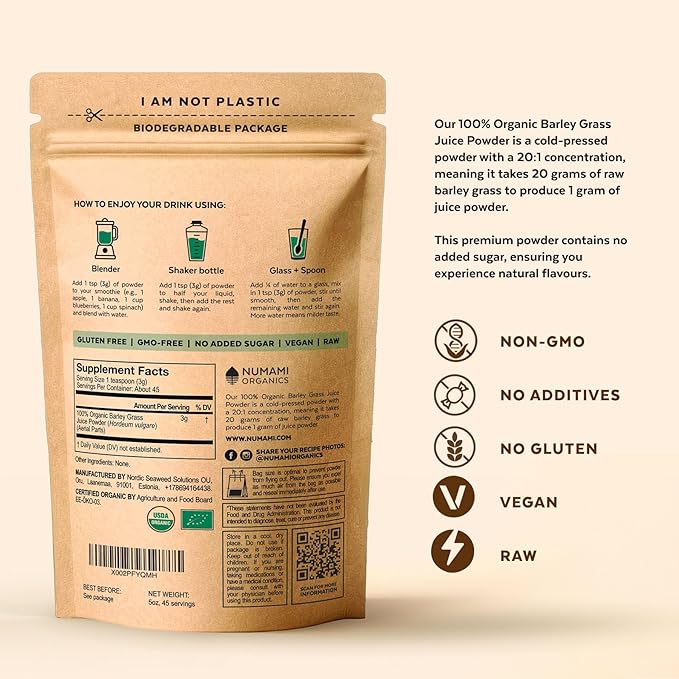 Numami Organic Barley Grass Juice Powder, Grown in USA, Pure Raw and Water Soluble, Add to Your Smoothie or Drink as a Juice
