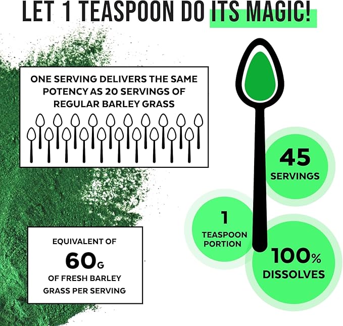 - Feeling BLOATED AND too much gas after taking plant based supplements? This is caused by the fiber contained in the plants which in excess amounts makes you feel discomfort. Our Barley Grass Juice Powder has only 4% fibers so you can enjoy all the nutritional benefits without worrying about bloated stomach.