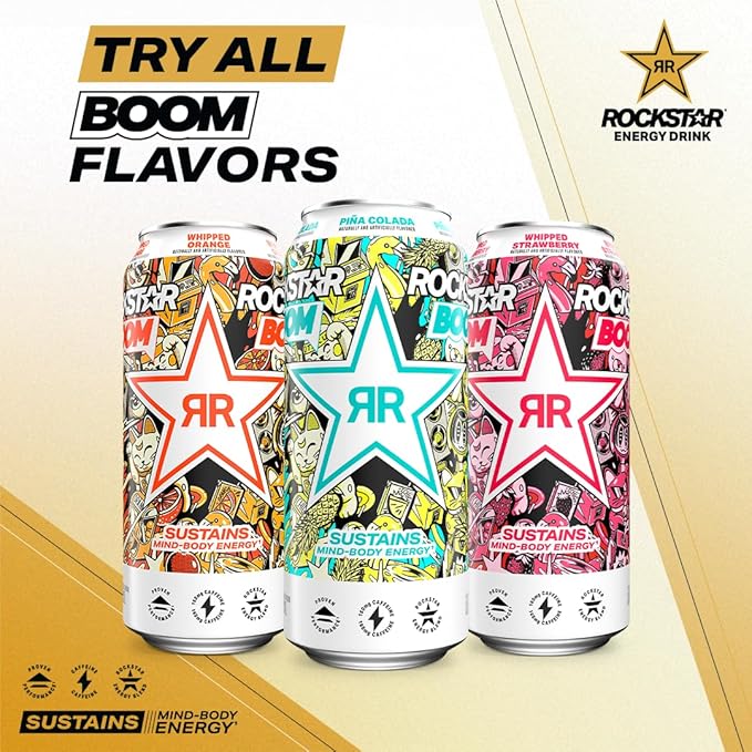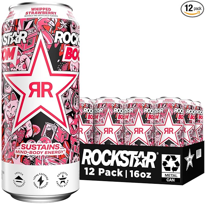 - Includes 12 (16oz) cans of Rockstar Energy Drink, Boom Whipped Strawberry