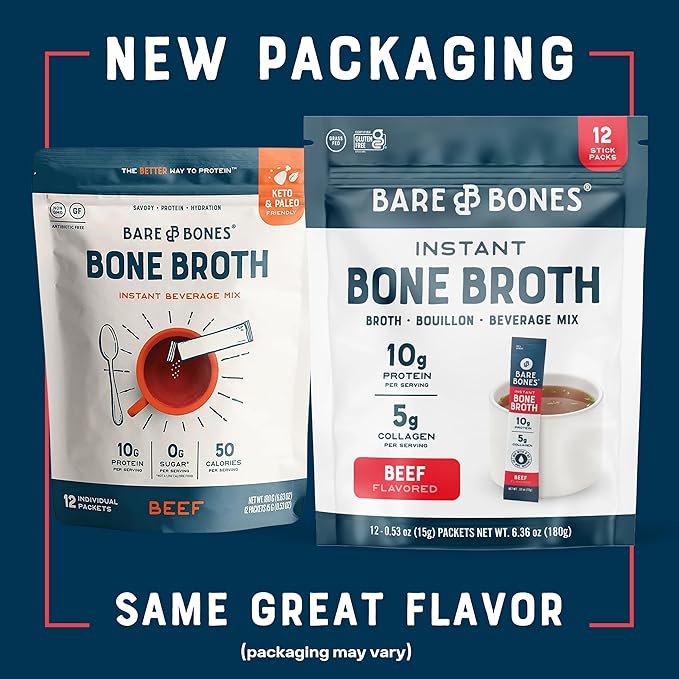 - AROMATIC DELICIOUS FLAVOR: Enjoy the taste and benefits of bone broth in convenient stick packs with Bare Bones Instant Beef Bone Broth. Made with real bone broth, grass-fed beef collagen, freshly ground herbs and spices, and more. Experience the deep, rich, savory flavor of real bone broth, crafted with quality ingredients that warm you from the inside out, wherever you are.