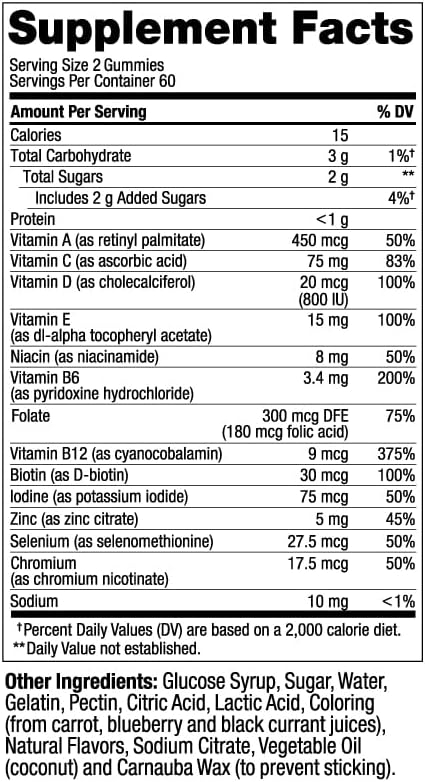 - NATURALLY DELICIOUS: These men's multivitamins come in naturally flavored Blackberry Blitz with no artificial colors or flavors and gluten-free. 120 gummies per pouch (60 day supply).Does Not Contain Any of the 8 Major Allergens