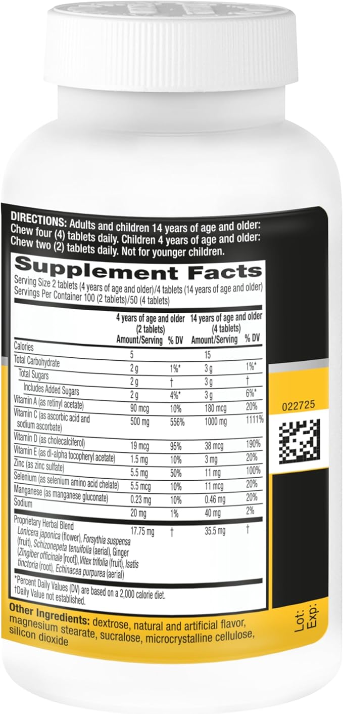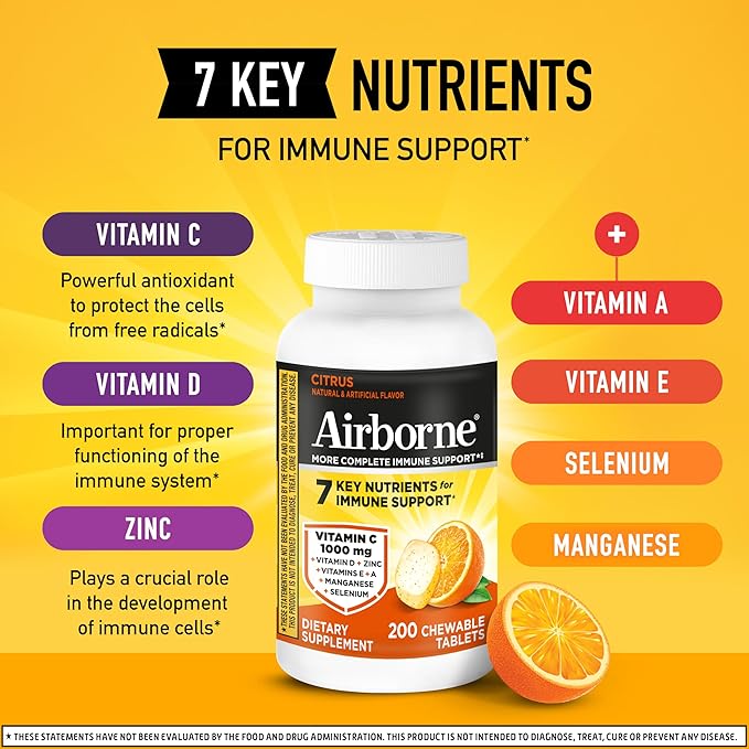 Airborne 1000mg Vitamin C with D and Zinc, Multivitamin Immune Support Supplement with Antioxidants A, C, and E, 200 Chewable Tablets, Citrus Flavor