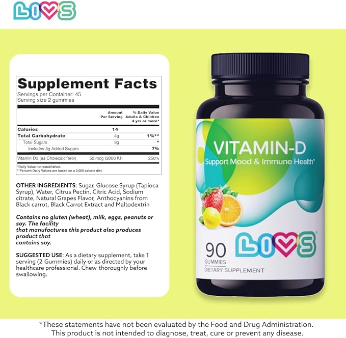 - Optimal Vitamin D3 2,000 IU Potency: Elevate your daily wellness with LIVS Vitamin D Gummies, each serving delivering a robust 2,000 IU of premium Vitamin D3. Designed for both women and adults, our delicious gummies ensure you get this vital nutrient, especially crucial for those with indoor lifestyles, complementing natural sunshine exposure effectively.