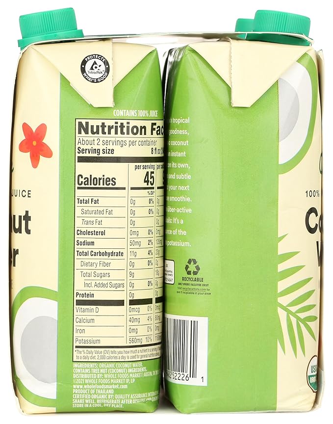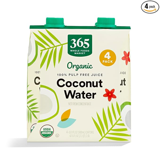 365 by Whole Foods Market, Organic Coconut Water, 100% Pulp-Free Juice, 16.9 Fl Oz per Carton, Pack of 4