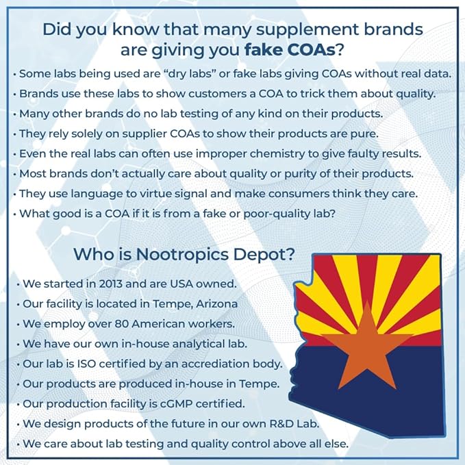 - LAB TESTED AND VERIFIED - All Nootropics Depot products are thoroughly lab tested to ensure our customers are receiving only the highest quality ingredients at the optimal strength, potency and purity. We take pride in the amount of research put into every product by sourcing only the highest quality and innovative ingredients.
