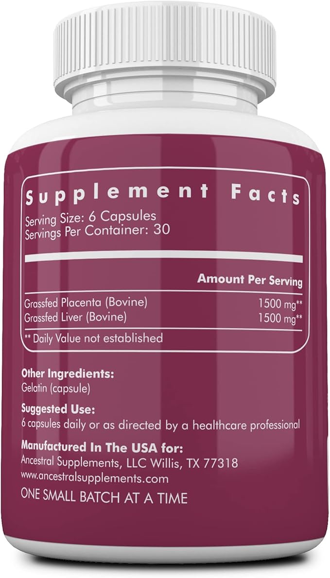 Ancestral Supplements Grass Fed Placenta Supplement with Liver, Contains Postpartum Vitamins for Women Breastfeeding, Promotes Menopause Relief, Stem Cells Support Skin Elasticity, 180 Capsules