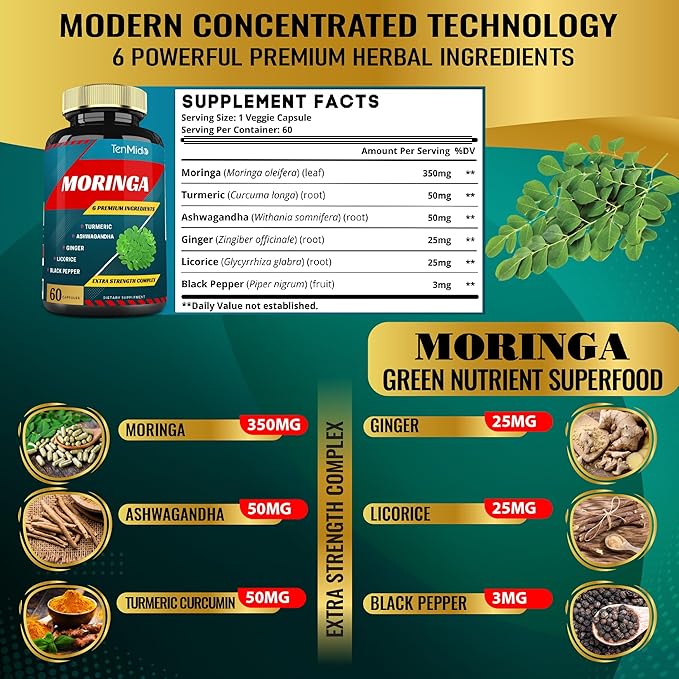 - ❤️ Professional Formula: Tenmido Moringa Capsules combine 5 powerful herbal problematic ingredients: Turmeric, Ashwagandha, Ginger, Licorice, Black Pepper powder. With the special optimized formula, our product set comes with 2 bottles is harmonious combination of native 6 premium herbs, bring you an energetic fresh life and effect on your health.