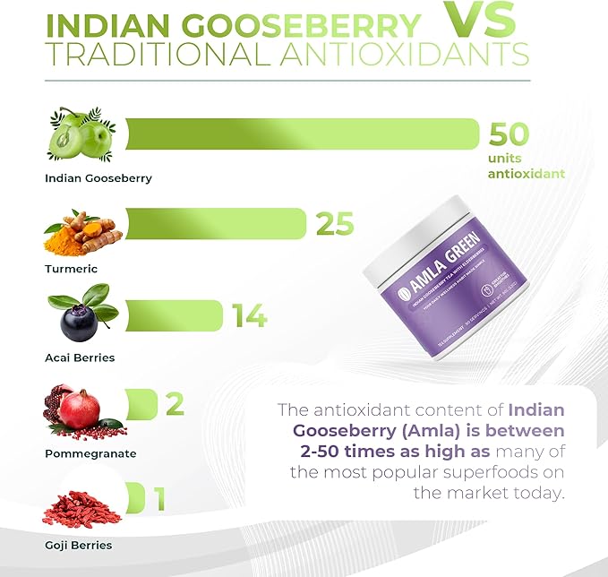 - THE ORIGINAL 20X CONCENTRATED AMLA SUPPLEMENT: Amla Green is your daily superfood powder supplement delivering unmatched antioxidative support through 20x concentrated amla with an ORAC Value of 261,500, which is 75 times higher than goji berries. Supported by published research, including clinical trials, amla has shown positive results for youthful benefits and critical areas of vitality and health.