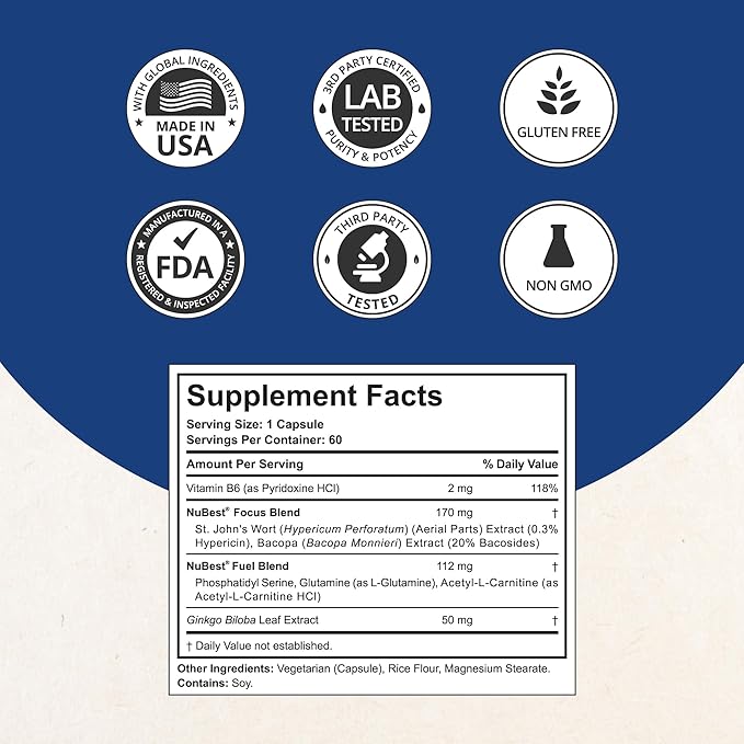- Ultra Strength Formula of NuBrain Supplement: Our brain supplement is designed with “brain foods” including St. John’s Wort, Bacopa Monnieri Vitamin B6, Ginkgo Biloba, Glutamine, Phosphatidylserine, Acetyl L-carnitine. These nutrients work as brain boosters that fuel neurotransmitters, and keep your mind and memory sharp.